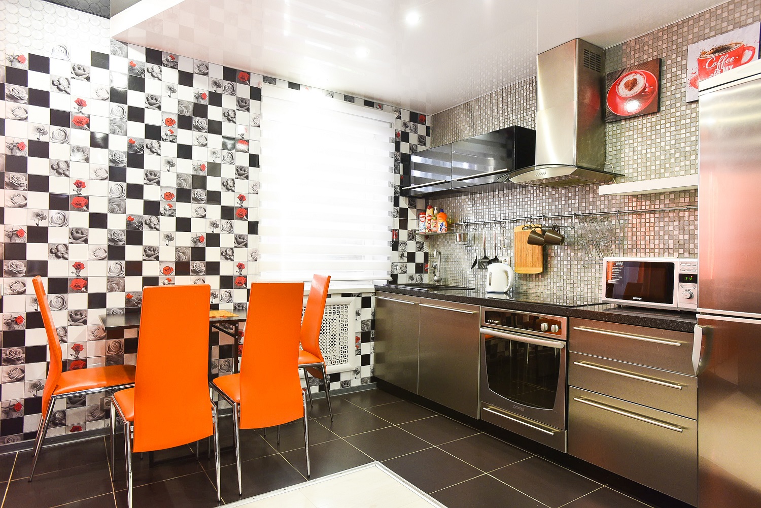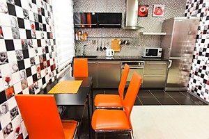 В квартире выполнен хороший дизайнерский евроремонт со стилем фьюжн, сочетающим в себе элементы модерна и хай-тека. Интерьер создает ощущение богемной роскоши с видимостью простоты. Большое значение играют выбранные цвета и формы. Яркие оранжевые акценты мебели на кухне делают помещение более жизнерадостным, теплым и активным. Для выгодной подачи света в гостиной используется точечное освещение. Интересный и оригинальный облик всему жилищу придает темная мебель, которая отлично сочетается с декором в белых и оранжевых тонах. Все имеющиеся предметы интерьера в гостиной выгодно смотрятся на фоне ультрасовременных фотообоев. В спальне соблюдена гармония. Особого шарма здесь придает необычная люстра и отделка одной из стен. В апартаментах имеется огромная лоджия, где, к слову, также выполнен авторский дизайн. Манящие взгляд фиолетовые шторы, сочетающиеся с малиновыми и коричневыми красками, привлекают внимание постояльцев не просто так! Из окна Вам откроется чудесный вид!